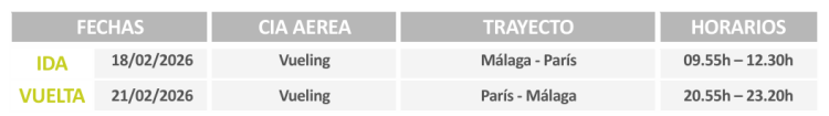 Desayuno, tiempo libre para últimas visitas y/o compras o visitar el BARRIO DE MONTMARTRE: Sagrado Corazón, Plaza de los pintores, Moulin Rouge. A la hora acordada, recogida del grupo en bus privado para traslado al aeropuerto. Facturación, salida del vuelo y llegada a Málaga. Despedida de nuestro/a monitor/a y fin de servicios.